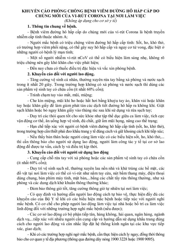 Khuyến cáo phòng chống bệnh viêm đường hô hấp cấp do chủng mới của vi-rút corona tại nơi làm việc