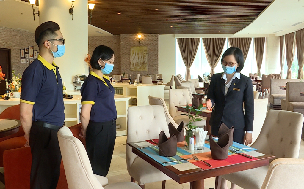 Cán bộ quản lý Khách sạn Sài Gòn - Hạ Long hướng dẫn nhân viên trang trí bàn ăn.