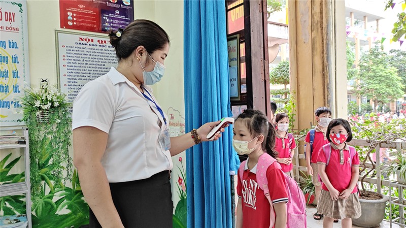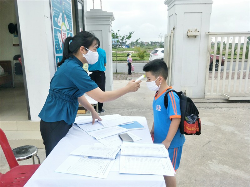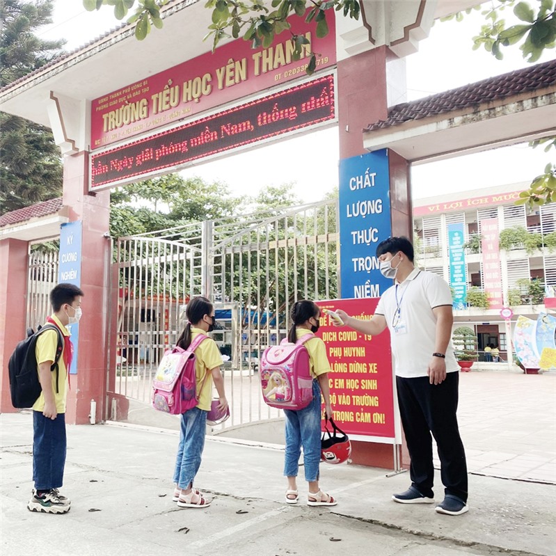 Trường Tiểu học Yên Thanh triển khai đo thân nhiệt cho học sinh.