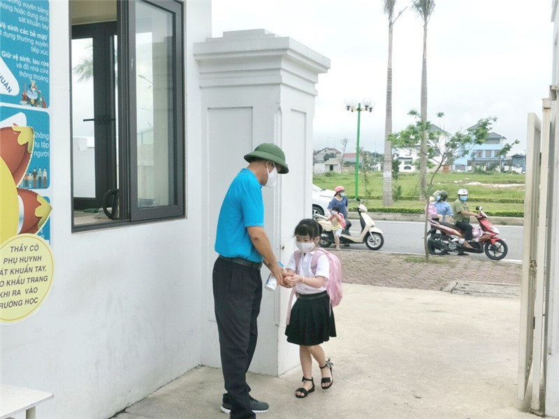 Trường TH Quốc tế Stephen Hawking thực hiện đo thân nhiệt và sát khuẩn cho học sinh trước khi vào lớp học.
