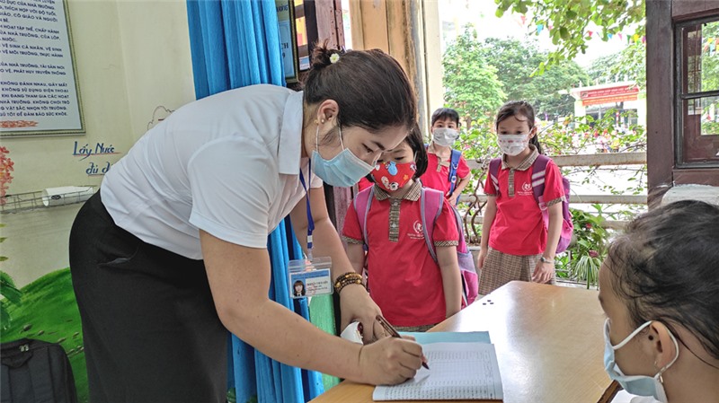 Trường Tiểu học Lê Lợi thực hiện đo thân nhiệt và khai báo vào sổ cá nhân của các học sinh.