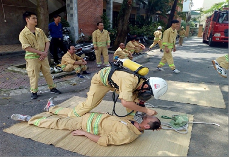 Lực lượng chuyên ngành Đội chữa cháy Công ty Nhiệt điện Uông Bí thực hành triển khai đội hình trong chữa cháy.