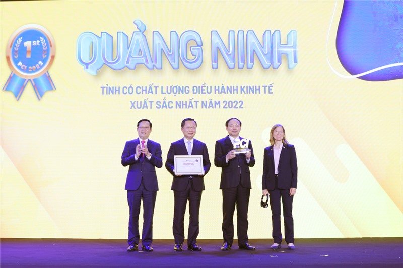 Các đồng chí lãnh đạo tỉnh Quảng Ninh nhận Cúp và Chứng nhận dẫn đầu bảng xếp hạng năng lực cạnh tranh cấp tỉnh (PCI) năm 2022. Ảnh: Song Hà