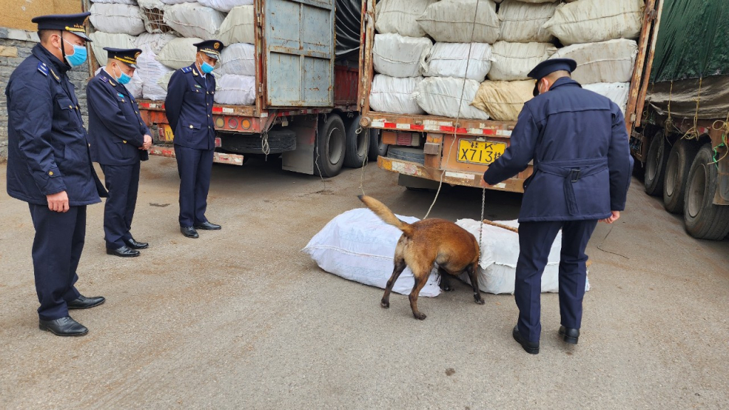 Chi cục Hải quan Cửa khẩu Hoành Mô (huyện Bình Liêu) sử dụng chó nghiệp vụ để kiểm tra hàng hoá XNK, đẩy mạnh phòng chống buôn lậu dịp cuối năm. Ảnh: Văn Bá
