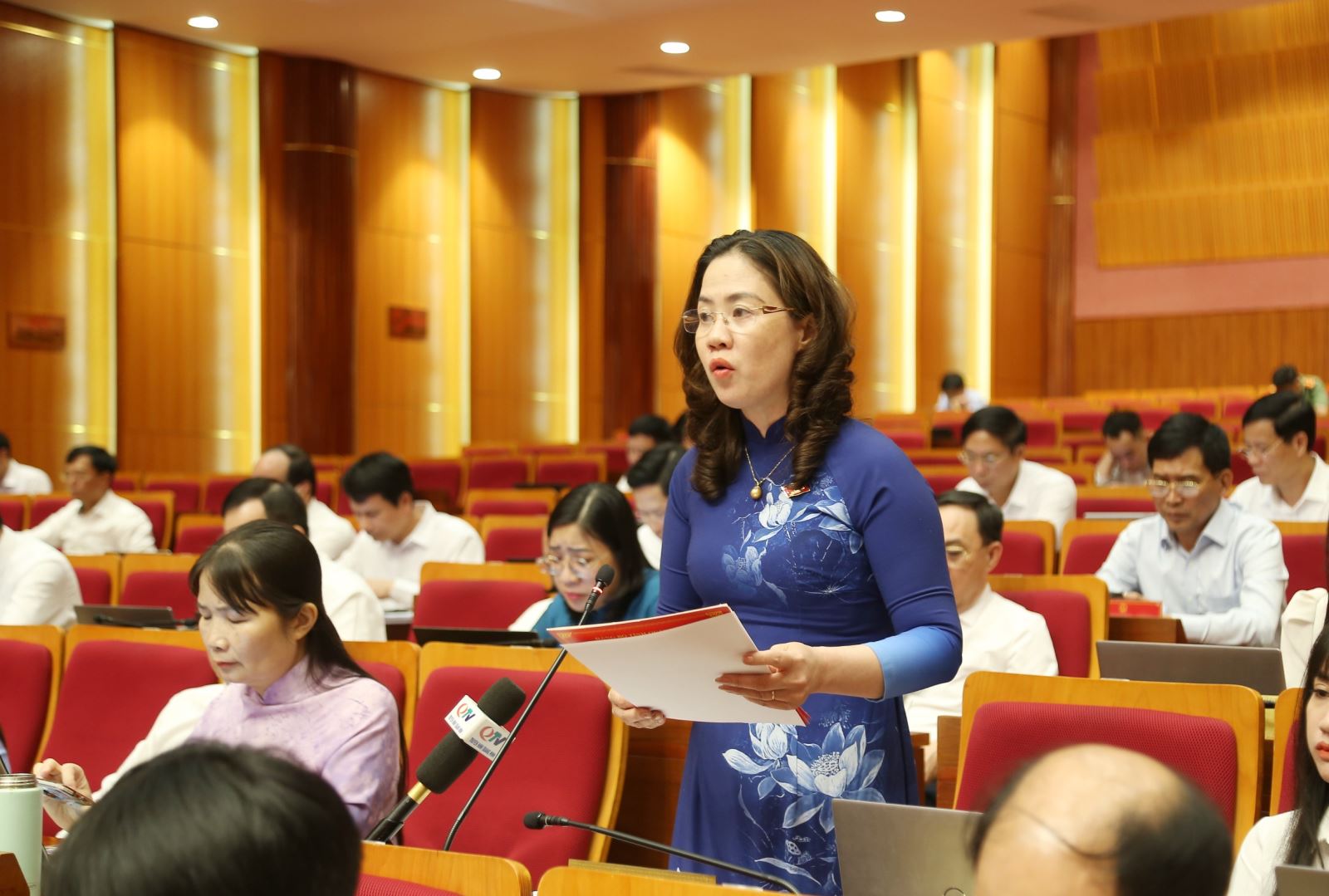 Đồng chí Nguyễn Thị Bích Liên, Trưởng Ban Tuyên giáo và Dân vận Thành ủy Đông Triều, đại biểu HĐND tỉnh, phát biểu thảo luận tại hội trường.