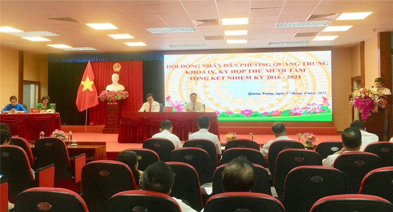 Chiều 17-4, HĐND phường Quang Trung khóa IX tổ chức kỳ họp thứ 18, nhằm tổng kết nhiệm kỳ 2016-2021, triển khai phương hướng, nhiệm vụ trong thời gian tới. Dự kỳ họp có đồng chí Đào Ngọc Sơn, UVBTV, Trưởng Ban Dân vận Thành ủy, Chủ tịch UBMTTQ thành phố.