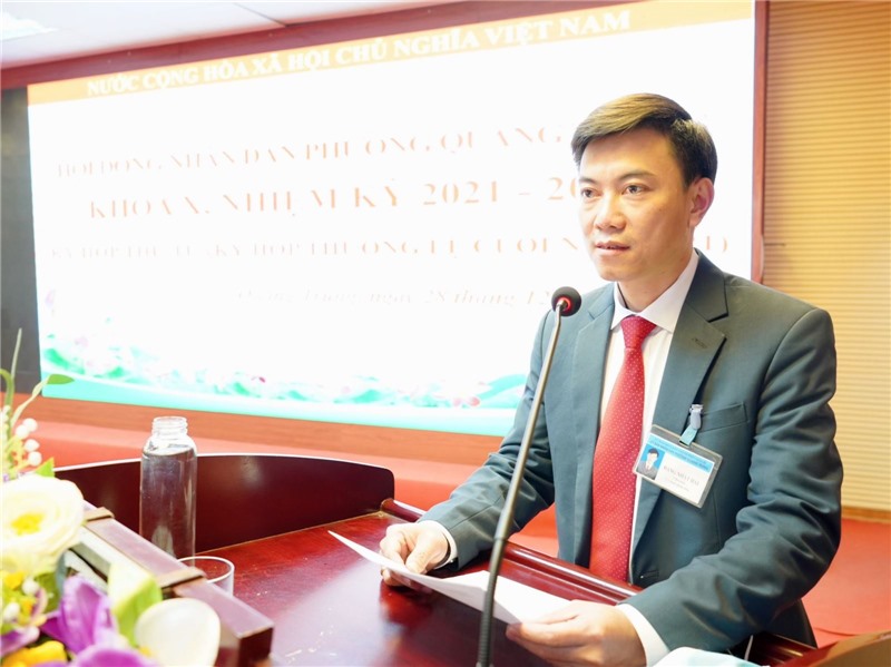 Đồng chí Đặng Nhật Hải, Phó Bí thư Đảng ủy, Chủ tịch UBND phường báo cáo tại kỳ họp.