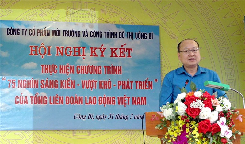 Sáng 31/3, Công ty CP Môi trường và Công trình Đô thị Uông Bí đã tổ chức Lễ ký kết thực hiện Chương trình “75 ngàn sáng kiến - vượt khó - phát triển” của Tổng LĐLĐ Việt Nam. Phó Chủ tịch LĐLĐ tỉnh Quảng Ninh Bùi Minh Thanh dự buổi lễ.