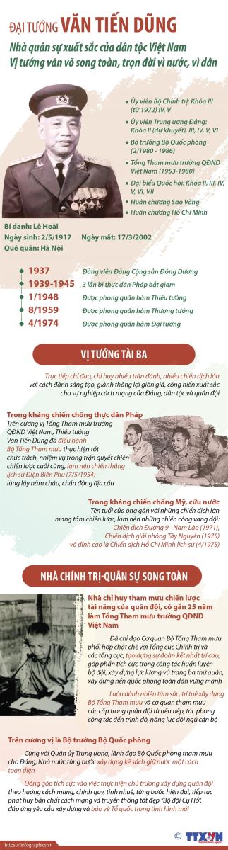 Đại tướng Văn Tiến Dũng là một vị tướng tài đức song toàn. Ông chính là nhà chiến lược quân sự tài ba, người đã góp phần quan trọng làm nên đại thắng mùa Xuân năm 1975, giải phóng hoàn toàn miền Nam, thống nhất đất nước.