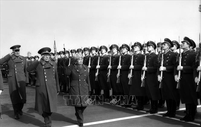 Đại tướng Võ Nguyên Giáp, Ủy viên Bộ Chính trị, Phó Thủ tướng kiêm Bộ trưởng Bộ Quốc phòng và Nguyên soái Ustinov duyệt đội danh dự, tại Moskva, ngày 10/3/77. Ảnh: Hứa Kiểm/TTXVN
