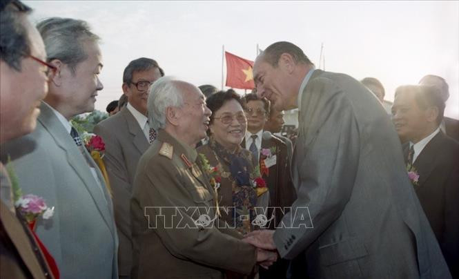 Đại tướng Võ Nguyên Giáp gặp Tổng thống Pháp Jacques Chirac thăm hữu nghị Việt Nam từ 12-15/11/1997. Ảnh: Cao Phong/TTXVN