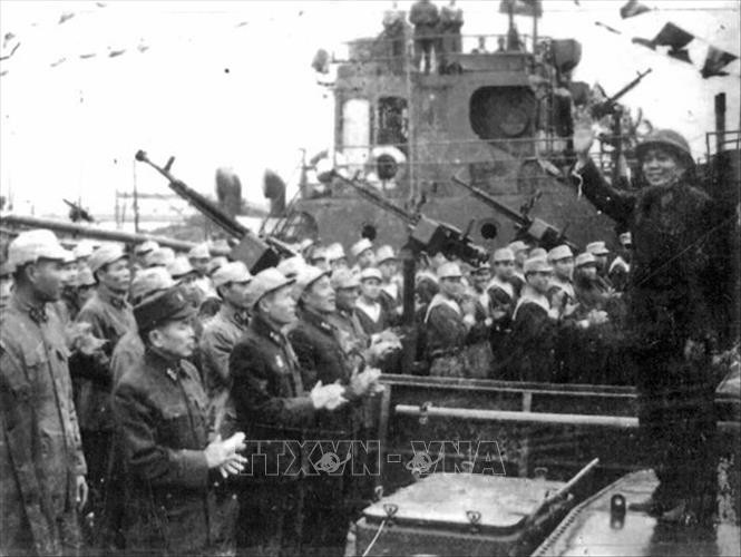 Đại tướng Võ Nguyên Giáp, Bộ trưởng Bộ Quốc phòng nói chuyện với cán bộ, chiến sĩ tàu C41 trong chuyến thăm Đoàn 125 Hải quân, năm 1970. Ảnh: Tư liệu/TTXVN phát