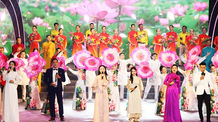 Các nghệ sĩ biểu diễn tại chương trình nghệ thuật “Người mẹ Làng Sen” nhân kỷ niệm 155 năm năm sinh bà Hoàng Thị Loan.