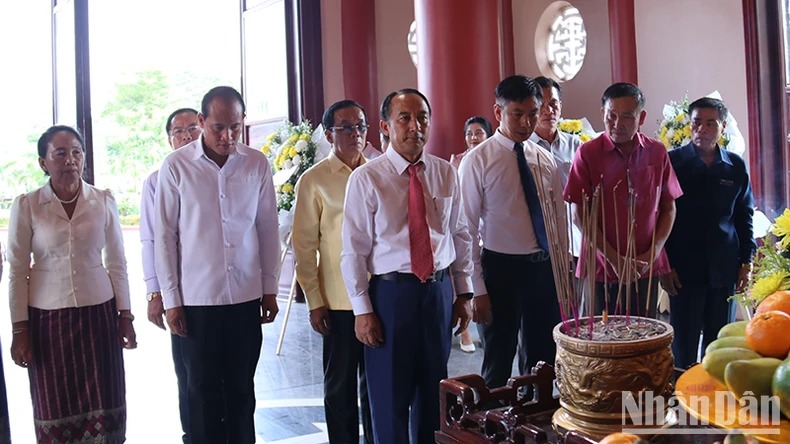 Đoàn đại biểu lãnh đạo tỉnh Khammouane (Lào) dâng hương tưởng niệm Chủ tịch Hồ Chí Minh. Ảnh: TRỊNH DŨNG