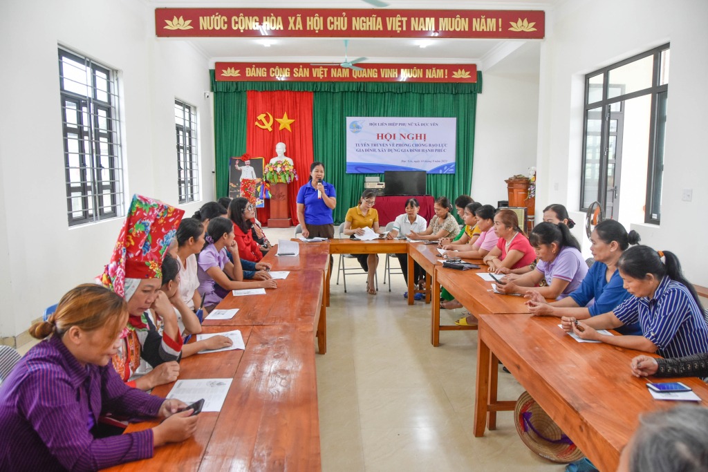 Một buổi sinh hoạt chuyên đề về phòng, chống bạo lực gia đình tại Chi hội Phụ nữ thôn Đông (xã Dực Yên, huyện Đầm Hà). Ảnh: Hoàng Giang