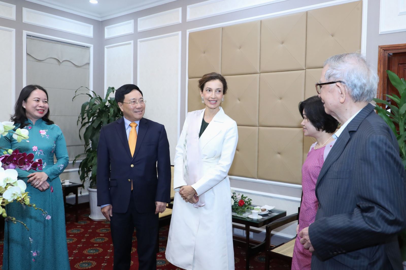 Phó Thủ tướng Thường trực Chính phủ Phạm Bình Minh, Phó Chủ tịch nước Võ Thị Ánh Xuân, Tổng Giám đốc Tổ chức UNESCO Audrey Azoulay cùng các đại biểu - Ảnh: VGP/Hải Minh