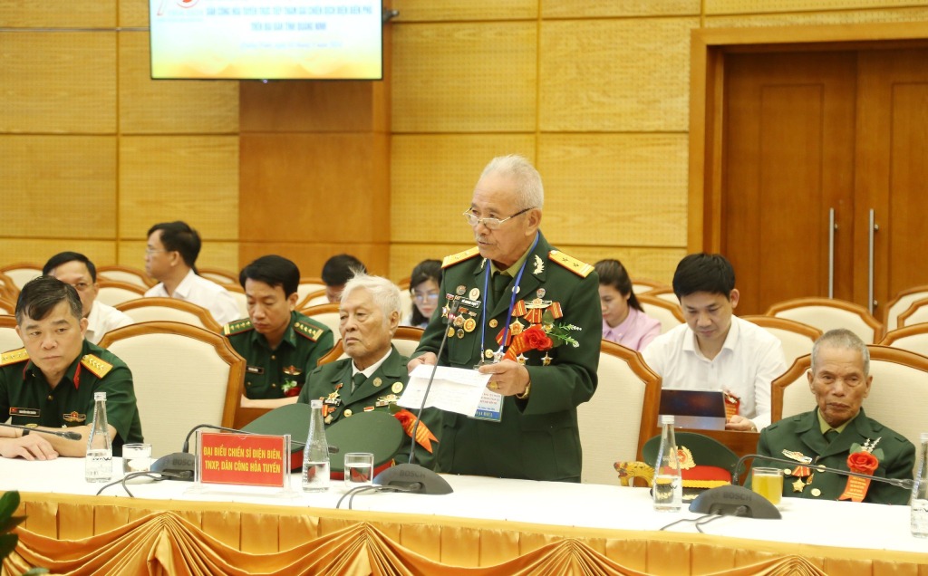 CCB Nguyễn Quang Phục (95 tuổi, huyện Đầm Hà) trao đổi tại Hội nghị gặp mặt, tri ân các Anh hùng liệt sĩ, chiến sĩ Điện Biên, TNXP, dân công hỏa tuyến tham gia Chiến dịch Điện Biên Phủ do tỉnh tổ chức ngày 2/5/2024 .