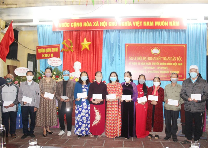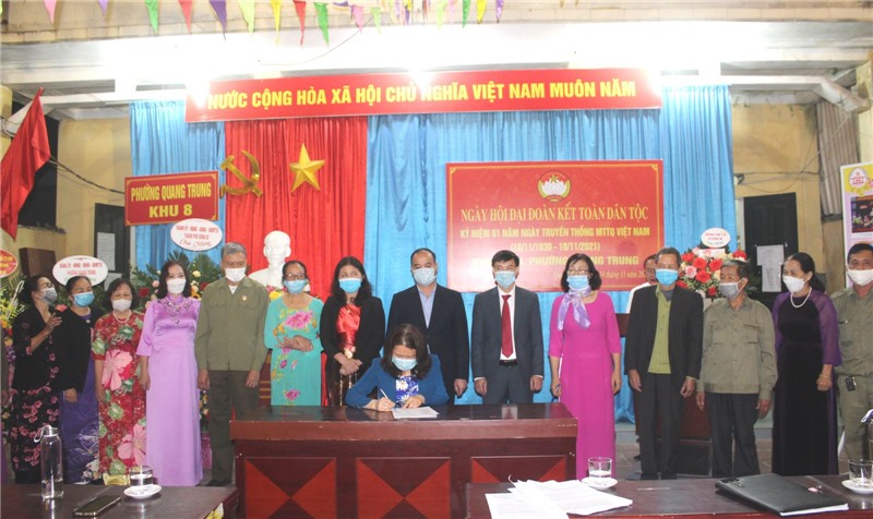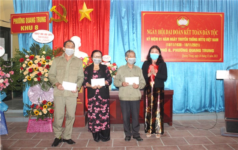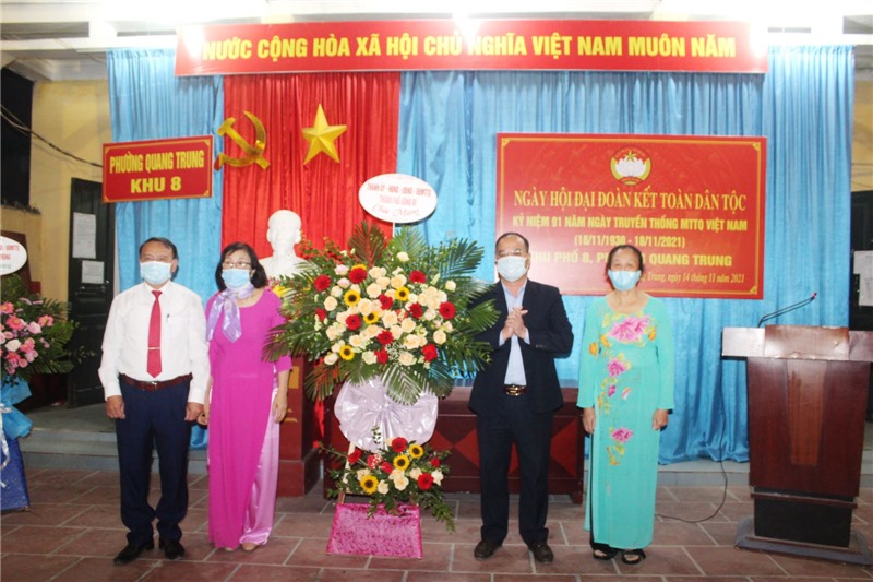 Kỷ niệm 91 năm Ngày thành lập Mặt trận dân tộc thống nhất - Ngày truyền thống MTTQ Việt Nam 18/11(1930-2021), 10 năm thành lập thành phố - 60 năm Uông Bí xây dựng và phát triển, 85 năm ngày Truyền thống Công nhân Vùng mỏ - Truyền thống ngành Than, tối ngày 14/11, khu 8, phường Quang Trung tổ chức Ngày hội Đại đoàn kết toàn dân tộc. Dự, chúc mừng có các đồng chí: Bùi Văn Thành, Phó Chủ tịch UBND thành phố; Hoàng Thị Thanh Huyền, Phó Chủ tịch Thường trực Ủy ban MTTQ thành phố.