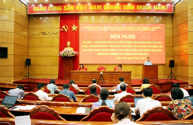 Khối thi đua các Ban Xây dựng Đảng, Văn phòng Tỉnh ủy, Đảng ủy Khối các cơ quan và doanh nghiệp tỉnh tổ chức Hội nghị tọa đàm “Giải pháp nâng cao chất lượng tham mưu công tác xây dựng, chỉnh đốn Đảng theo Kết luận số 21-KL/TW ngày 25/10/2021 của Ban Chấp hành Trung ương Đảng” và triển khai nhiệm vụ những tháng cuối năm 2023, tháng 7/2023. Ảnh: Mạnh Trường