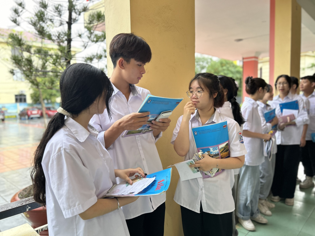 Các bạn học sinh cùng nhau ôn lại bài trước khi vào phòng thi.