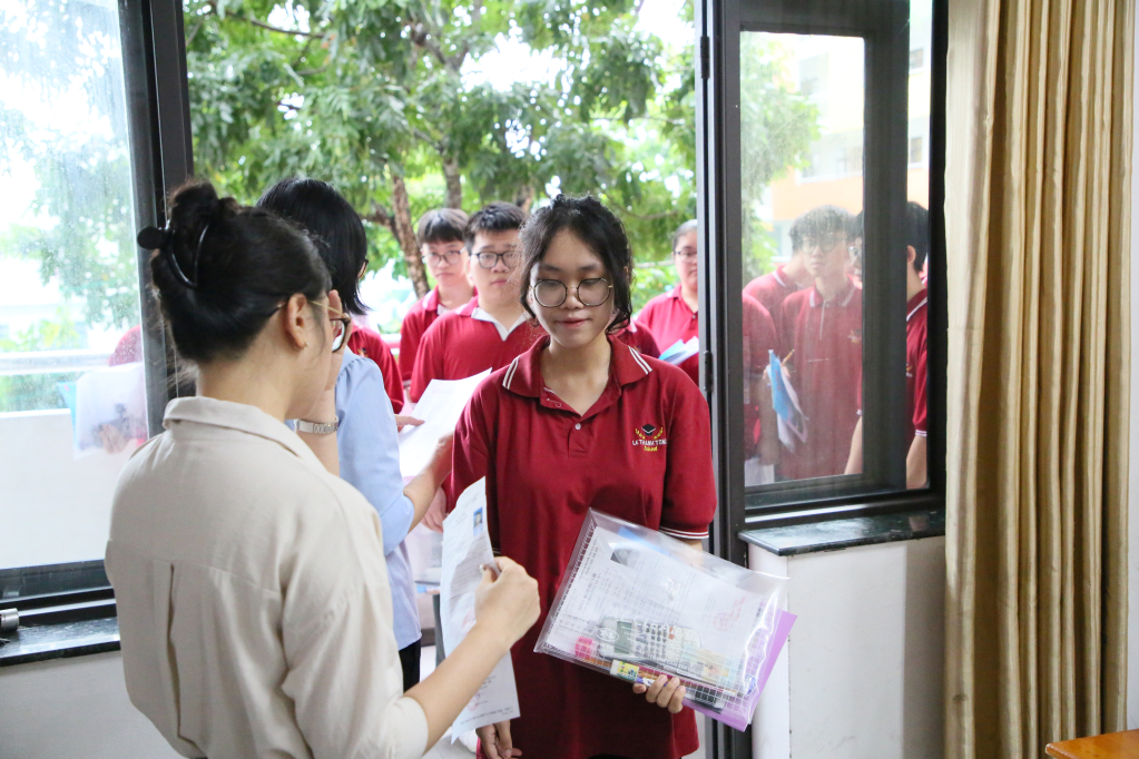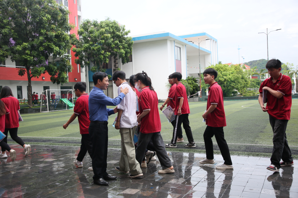 Đại diện Ban Giám hiệu Trường TH, THCS & THPT Lê Thánh Tông đón các em học sinh dưới sân trường, động viên các em làm bài thi thật tốt.