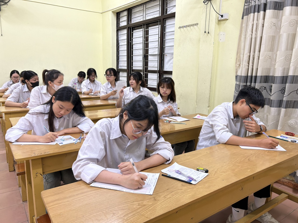 Các sĩ tử tại điểm thi Trường THPT Lương Thế Vinh (TP Cẩm Phả) tập trung ghi thông tin vào giấy thi, sẵn sàng làm bài thi.