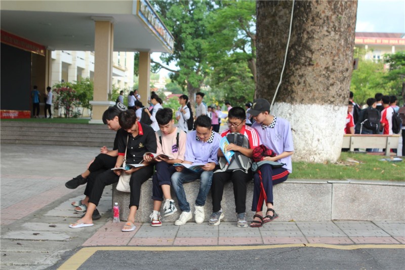 Thí sinh tranh thủ ôn lại kiến thức trước giờ vào phòng thi.