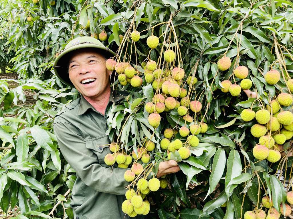 Niềm vui của ông Vũ Văn Lân (tổ 1, cầu Đá Bạc, phường Phương Nam) bên vườn vải sai trĩu quả.