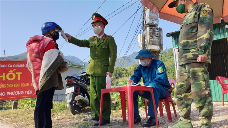 Công an, lực lượng an ninh xã Quảng Sơn, huyện Hải Hà đo thân nhiệt cho người dân, kiểm soát dịch Covid-19 tại địa bàn.