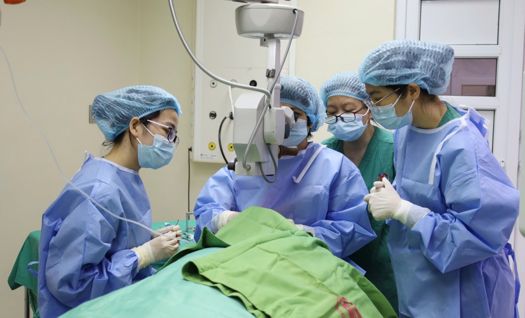 Các y, bác sĩ thực hiện kỹ thuật ghép giác mạc.