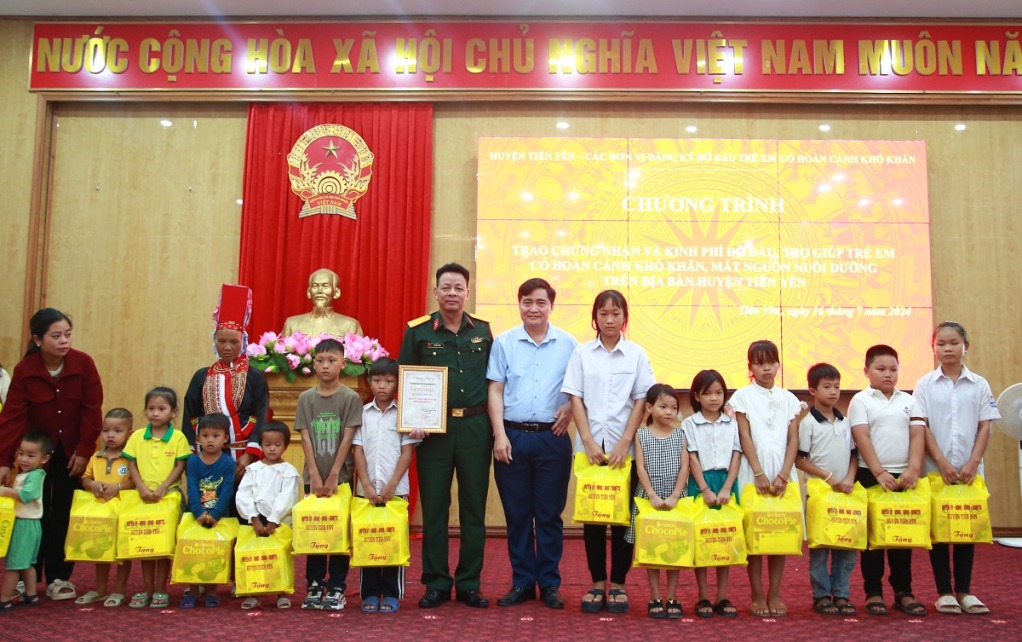Đại diện Công ty Đông Bắc trao kinh phí hỗ trợ đỡ đầu trẻ em có hoàn cảnh khó khăn trên địa bàn huyện Tiên Yên (tháng 7/2024). Ảnh: Trần Hoàn (CTV)