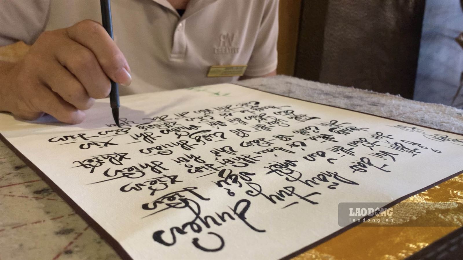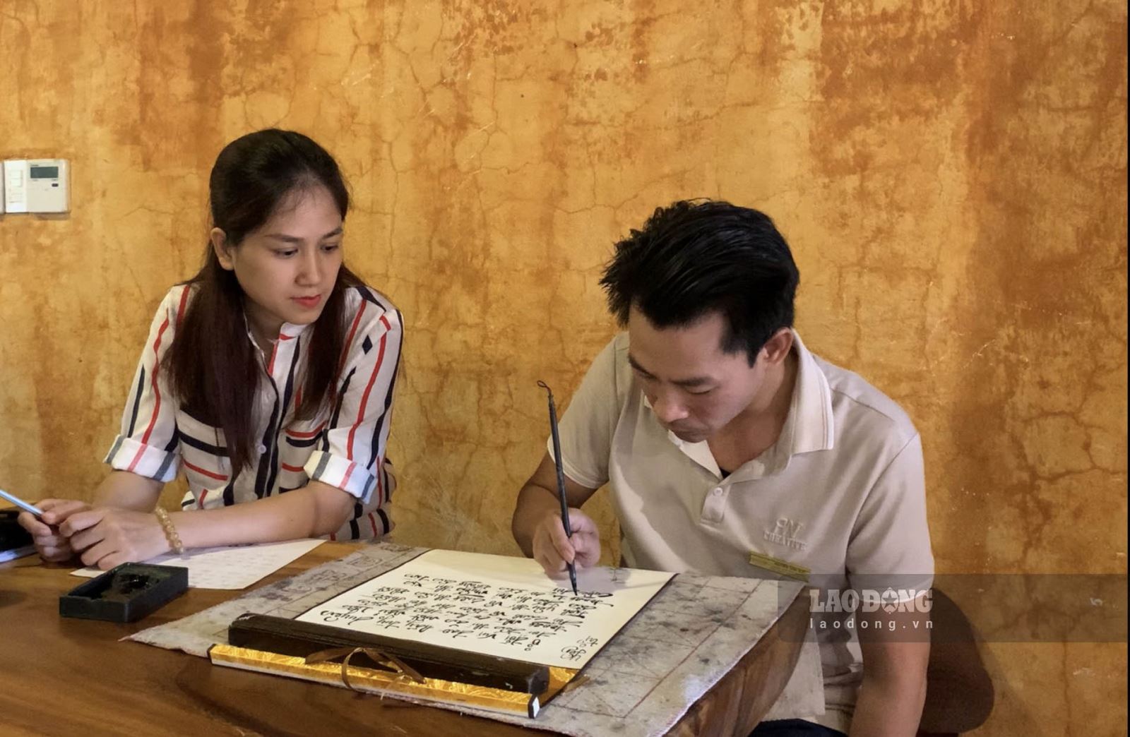 Du khách tham gia sáng tác thơ, viết chữ thư pháp tại khu vực "Góc trải nghiệm". Ảnh: Thiên Hà.