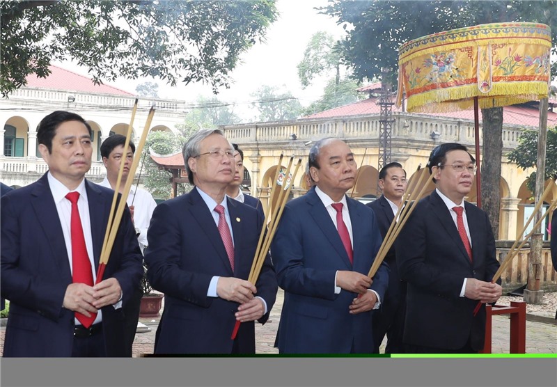 Thủ tướng Nguyễn Xuân Phúc và các đồng chí lãnh đạo Đảng, Nhà nước dâng hương tại điện Kính Thiên, Hoàng thành Thăng Long. - Ảnh: VGP