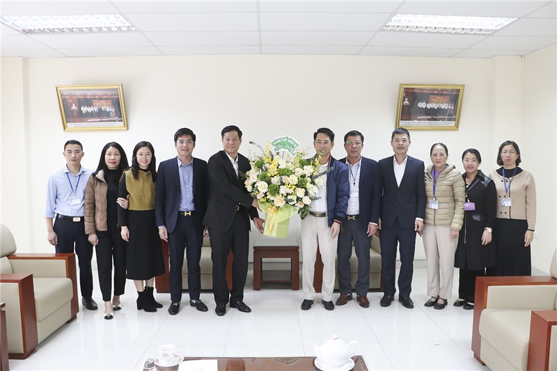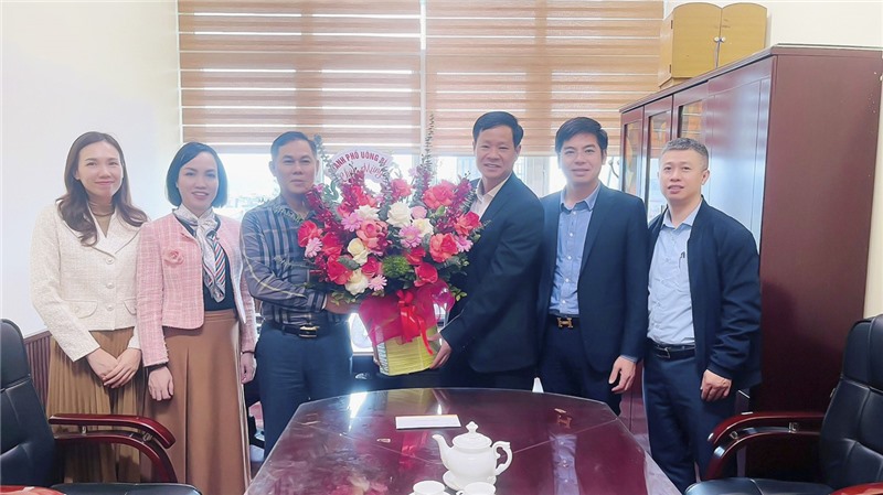 Đồng chí Phạm Tuấn Đạt - Phó Bí thư Thành uỷ, Chủ tịch UBND Thành phố cùng đoàn công tác tặng hoa, động viên cán bộ, nhân viên Kho bạc Nhà nước Uông Bí.