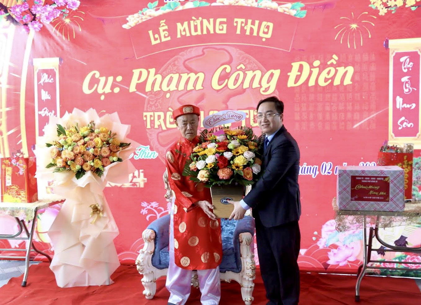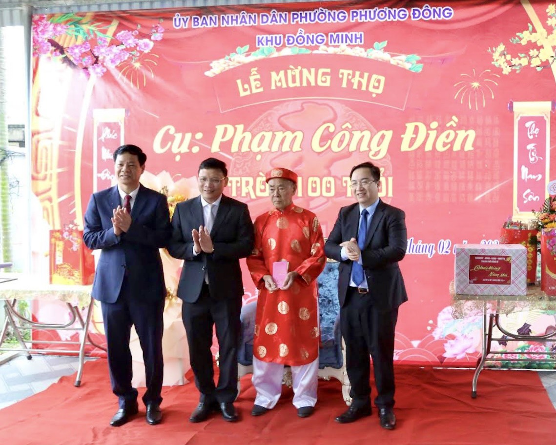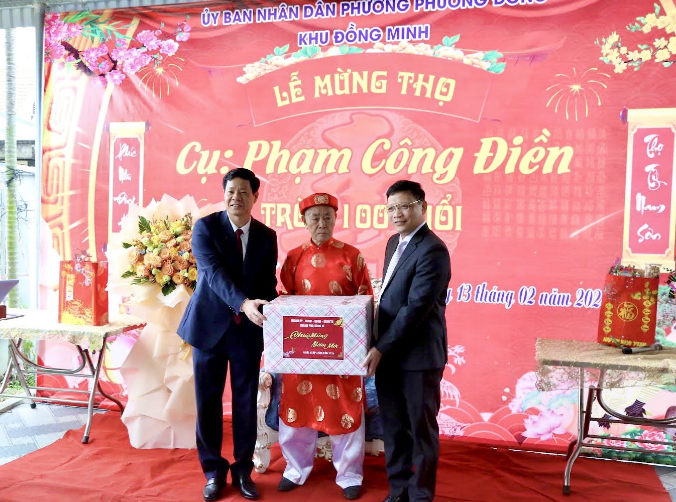 Lãnh đạo thành phố và lãnh đạo phường Phương Đông cũng trao tặng quà và chúc thọ cụ Phạm Công Điền.