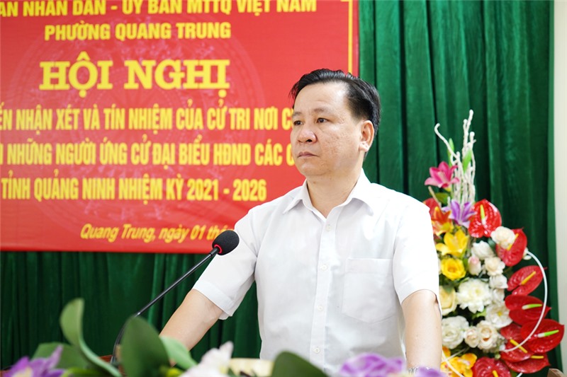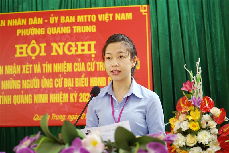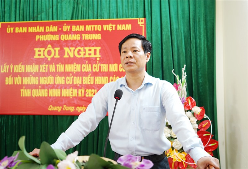Tại hội nghị, Ủy ban MTTQ phường Quang Trung đã công bố danh sách, tiểu sử của 10 người ứng cử viên đại biểu HĐND các cấp nhiệm kỳ 2021-2026. Trong đó, ứng cử đại biểu HĐND thành phố có 5 ông, bà: Ông Phạm Tuấn Đạt, PBT Thường trực Thành ủy, Chủ tịch HĐND thành phố; ông Nguyễn Trung Hải - Uỷ viên BTV Thành ủy, Bí thư Đảng uỷ phường Quang Trung; ông Nguyễn Văn Hưng, Thành ủy viên, Bí thư Đảng ủy, Chủ tịch UBND phường Phương Đông; ông Phan Minh Toàn, Thành ủy viên, Bí thư Thành đoàn Uông Bí; bà Phạm Thị Hoài, Trưởng Ban nữ công LĐLĐ thành phố. 3 ứng cử viên đại biểu HĐND phường Quang Trung gồm: bà Nguyễn Thị Bình, Bí thư, Trưởng khu 5B; ông Phạm Tuấn Nghiêm - Khu 5B; bà Đoàn Thị Oanh - Chi hội trưởng Chi hội nông dân của khu. 2 ứng cử viên được giới thiệu ứng cử đại biểu HĐND phường Thanh Sơn, Vàng Danh gồm Ông Lê Minh Quyết - Công an phường Thanh Sơn; Ông Phạm Công Hạnh - Cán bộ Công ty CP Than Vàng Danh.