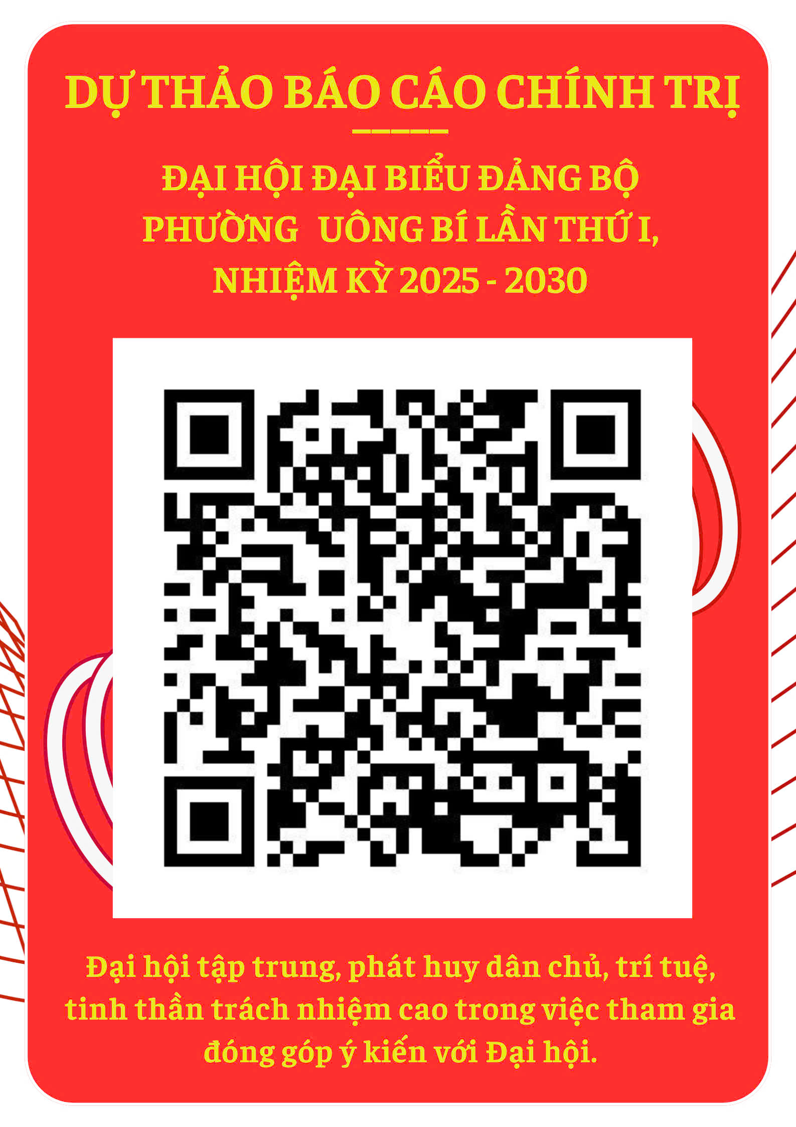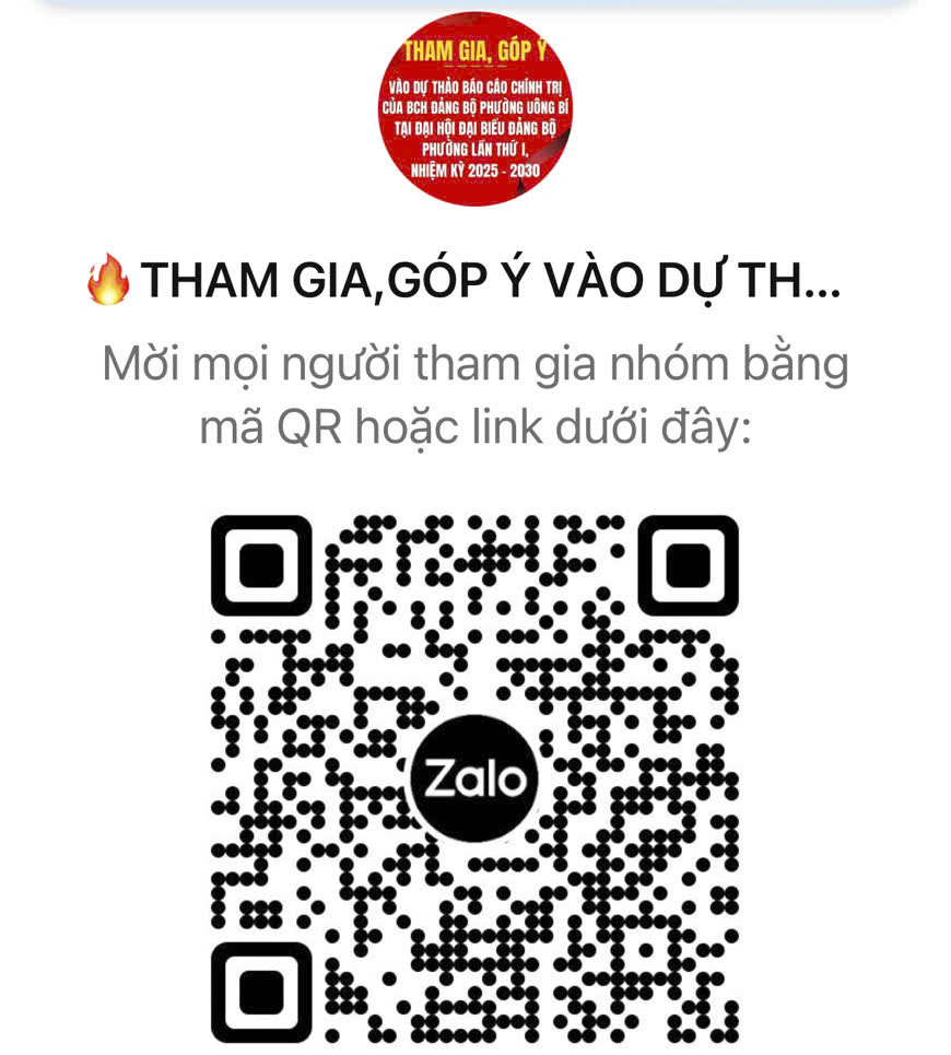 Góp ý trực tiếp: Truy cập vào nhóm zalo: “Tham gia, góp ý vào Dự thảo Báo cáo chính trị trình Đại hội đại biểu Đảng bộ phường Uông Bí lần thứ nhất, nhiệm kỳ 2025-2030” để góp ý (mã QR)