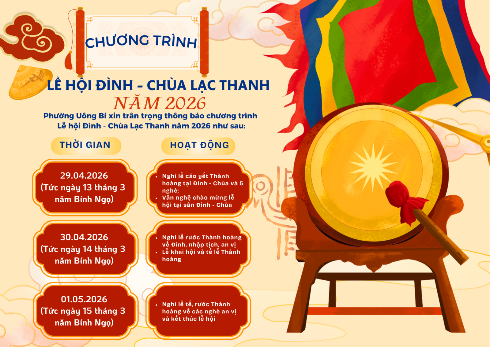 Lễ hội Đình – Chùa Lạc Thanh năm 2026 sẽ diễn ra từ 29/4 đến 01/5/2026 tại khu vực Đình – Chùa và các Nghè