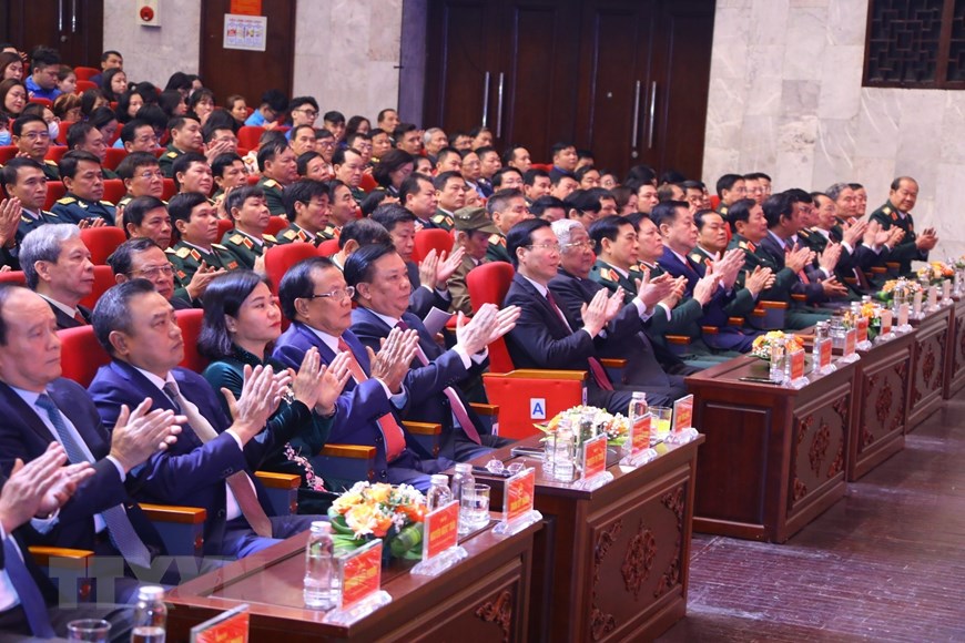 Các lãnh đạo, nguyên lãnh đạo Đảng, Nhà nước và các đại biểu dự buổi lễ. (Ảnh: Văn Điệp/TTXVN)