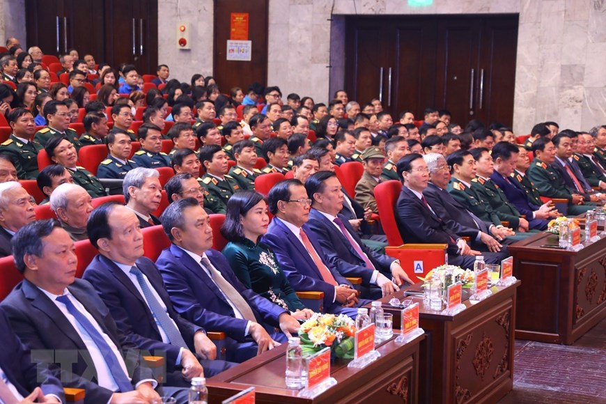 Các đại biểu dự buổi lễ kỷ niệm 50 năm Chiến thắng Hà Nội-Điện Biên Phủ trên không. (Ảnh: Văn Điệp/TTXVN)