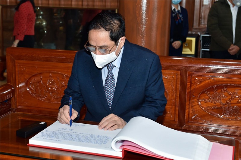 Thủ tướng ghi lưu bút tại Đền thờ Chủ tịch Hồ Chí Minh và các anh hùng, liệt sĩ tỉnh Quảng Bình. Ảnh: VGP/Nhật Bắc