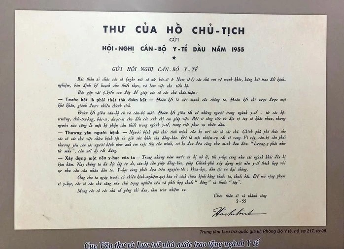 Bản sao Thư của Hồ Chù tịch gửi Hội nghị cán bộ Y tế đầu năm 1955. Ảnh tư liệu