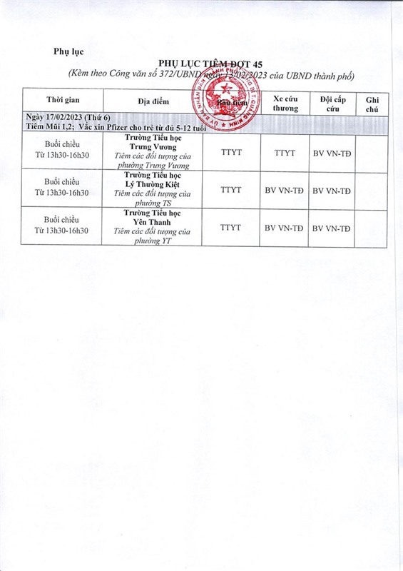 Lịch tiêm vắc xin phòng Covid - 19 cho đối tượng trẻ từ 5 - 12 tuổi (đợt 45)
