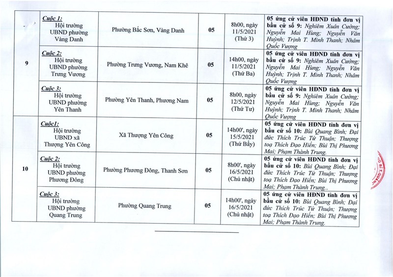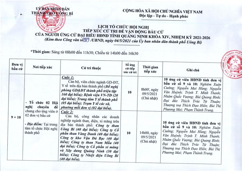 Lịch tổ chức hội nghị tiếp xúc cử tri để vận động bầu cử của người ứng cử Đại biểu HĐND tỉnh Quảng Ninh khóa XIV, nhiệm kỳ 2021-2026