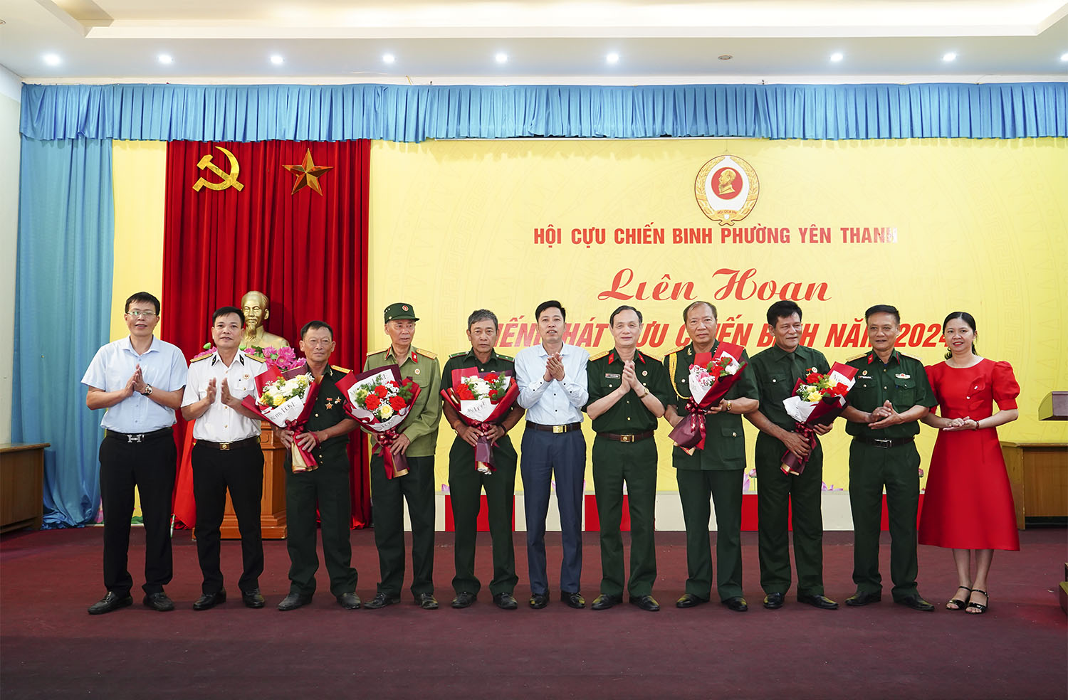 Các đồng chí Lãnh đạo hội Cựu chiến binh thành phố và các đồng chí lãnh đạo phường Yên Thanh tặng hoa chúc mừng các chi hội về tham gia liên hoan.