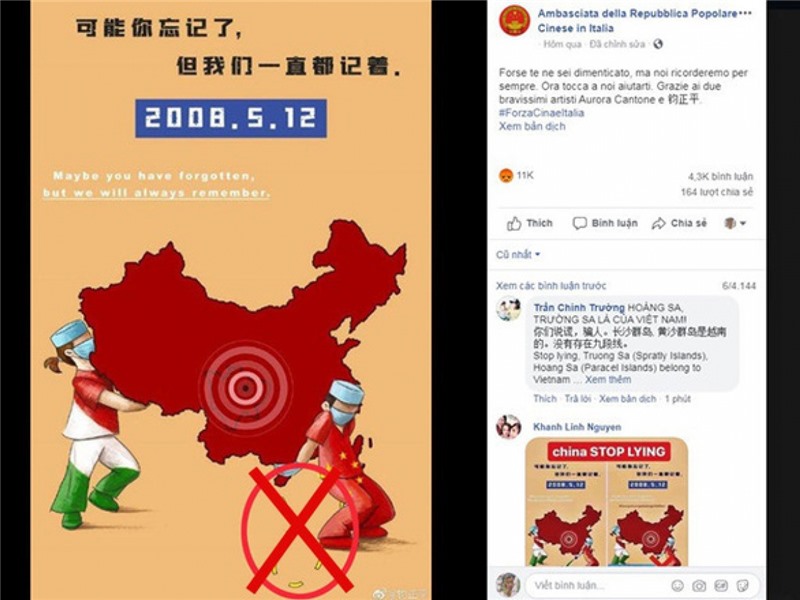Trước đó, khi dịch COVID-19 bùng phát trên toàn cầu, Đại sứ quán Trung Quốc tại Ý đăng lên Facebook và Twitter bức tranh nhân viên y tế hai nước cùng nâng bản đồ hai nước, thể hiện ý đồ tri ân và giúp đỡ lẫn nhau vượt qua COVID-19. Phần bản đồ Trung Quốc trong tranh lại đính thêm “đường lưỡi bò”.