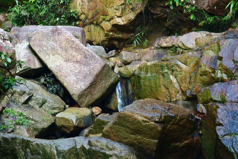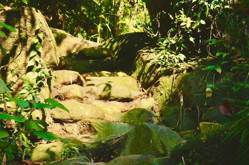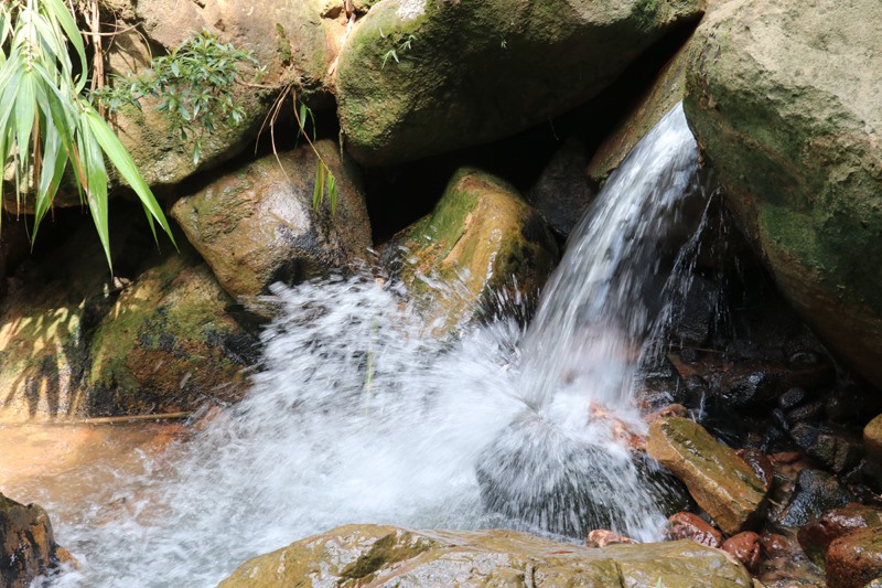 Từ khu vực gửi xe, du khách sẽ trải nghiệm chừng 10 phút đi bộ đường mòn, len lỏi dưới những tán cây dóc, cây bụi, dây leo lâu năm, bước trên dốc đá ghồ ghề… để đến với khu suối nước đầu tiên của điểm du lịch. Đây thường được coi là 1 điểm dừng chân ngắn để du khách nghỉ ngơi, chuẩn bị tiếp tục hành trình chinh phục ngọn thác đầu tiên.