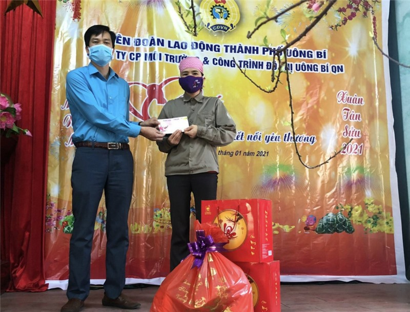 Chủ tịch Công đoàn Công ty CP Môi trường và công trình đô thị Uông Bí Hoàng Văn Hưng trao quà cho công nhân dịp Tết Nguyên đán Tân Sửu 2021.