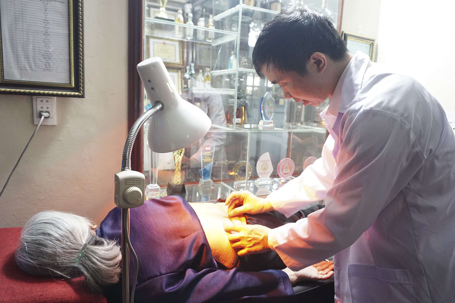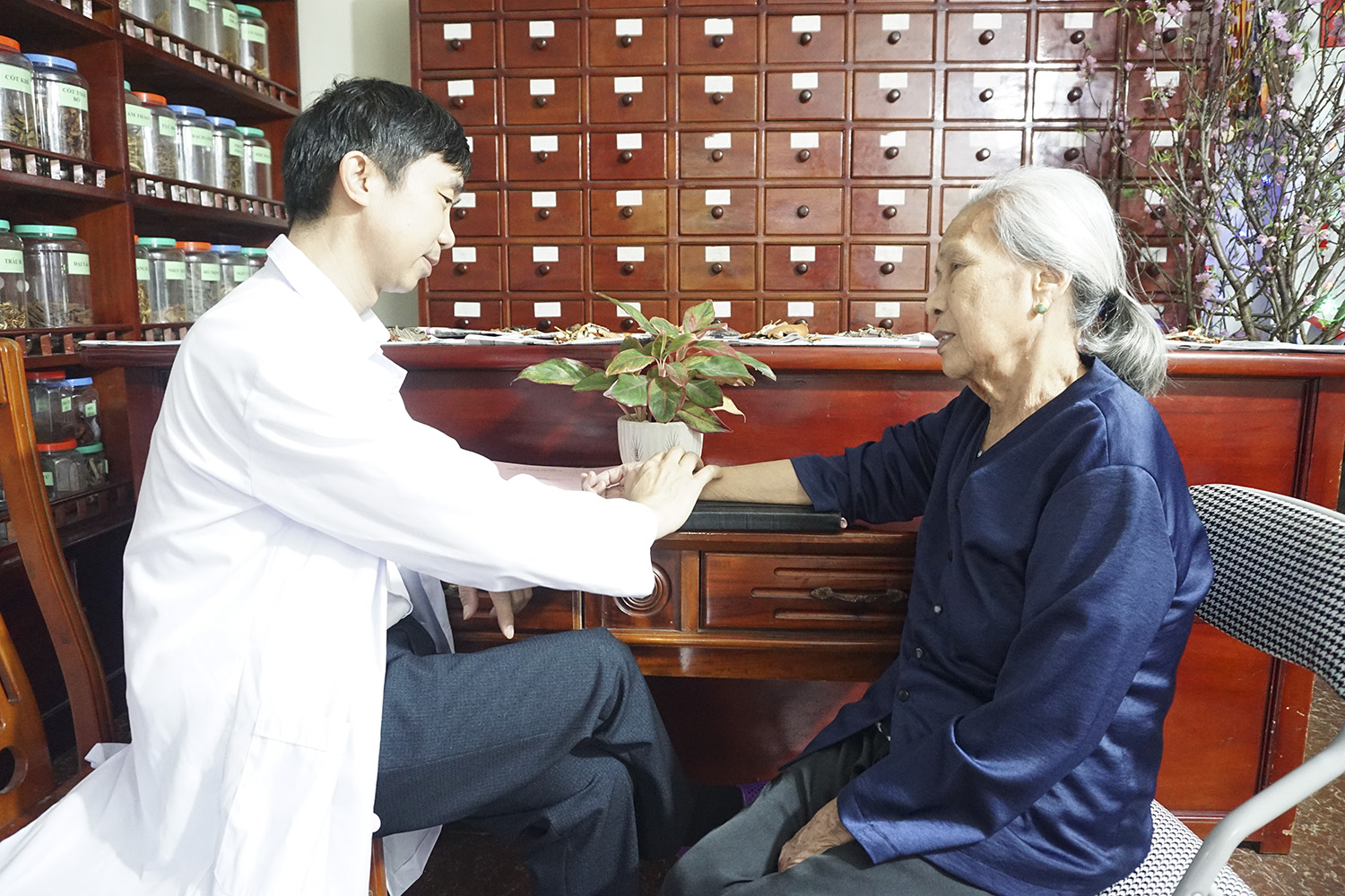 Lương y Nguyễn Văn Mạnh thăm khám, chẩn đoán, tư vấn sức khoẻ cho bệnh nhân.