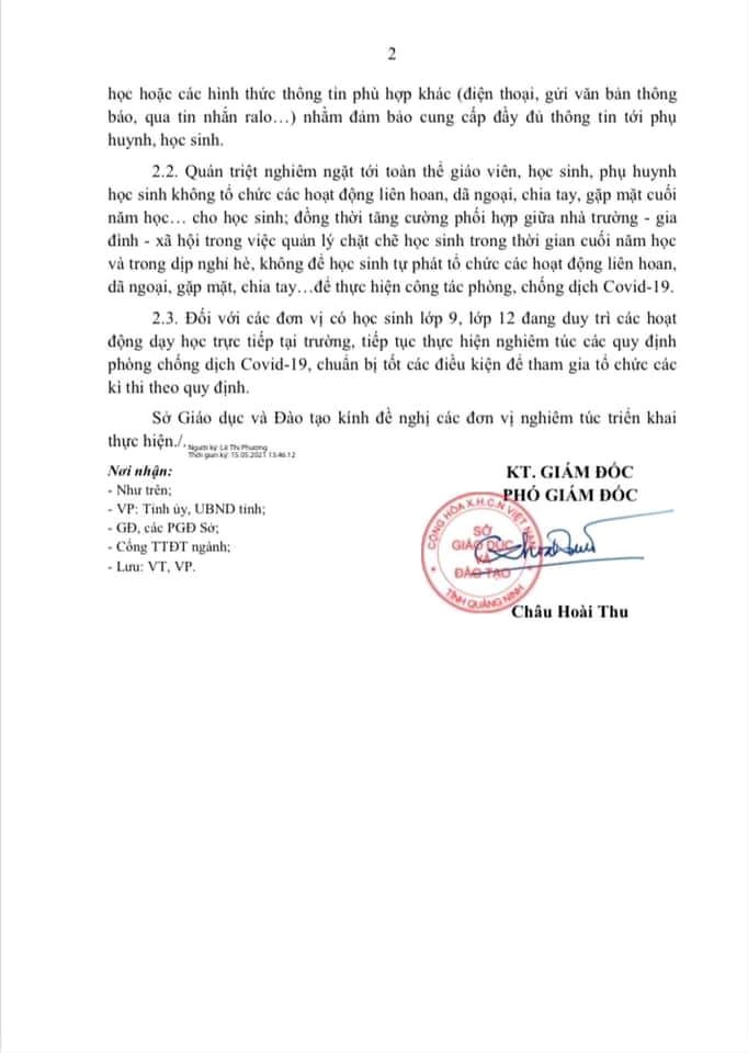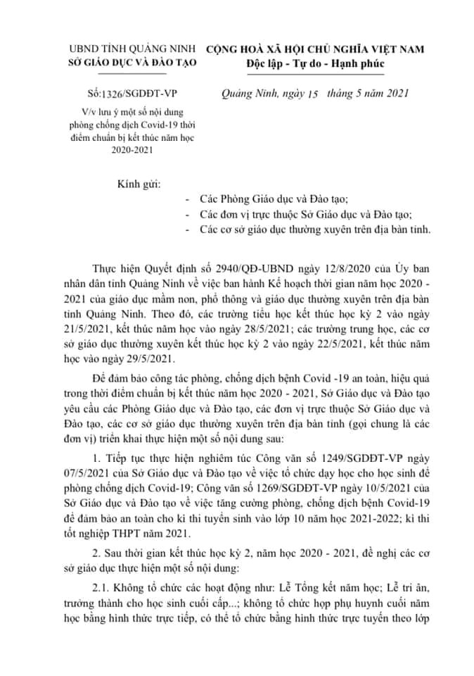 Vừa qua, Sở GD-ĐT tỉnh Quảng Ninh ban hành công văn số 1326/SGDĐT-VP về việc lưu ý một số nội dung phòng, chống dịch Covid-19 thời điểm chuẩn bị kết thúc năm học 2020-2021